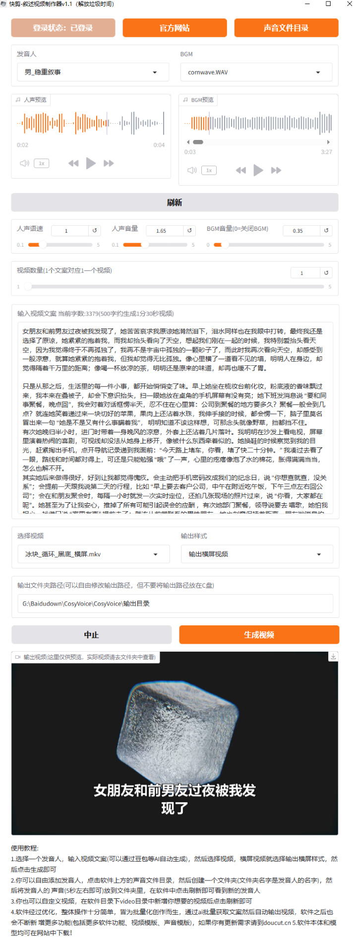 叙述视频生成器v1.1 -自动生成-省时省力 快剪 下载此软件后还需要下载模型-点击这里下载 这几年抖音叙事视频非常火热,通过声音+画面就轻松达到了几十万播放 所有的视频都是一个模版 叙述视频生成器v1.1上线!你只需要让ai生成文案然后粘贴到快剪软件中,即可生成视频,并且还可以一次性生成5个视频,大大降低了这类视频的制作门槛!!使用非常简单! 更新历史: v1.1:叙述视频生成器正式上线! 工具内置十七个发音人! 十五个视频模版! 资源下载下载价格VIP专享仅限VIP下载升级VIP立即购买